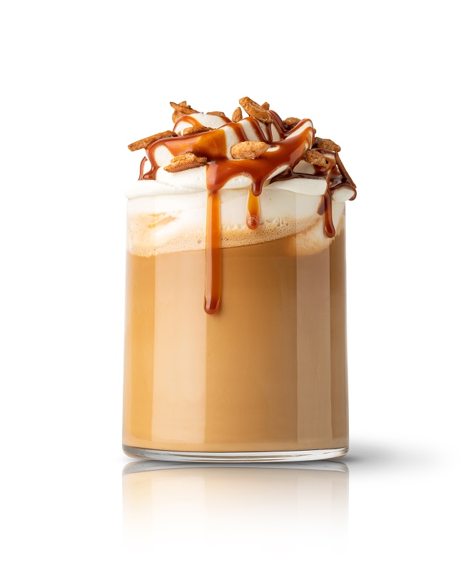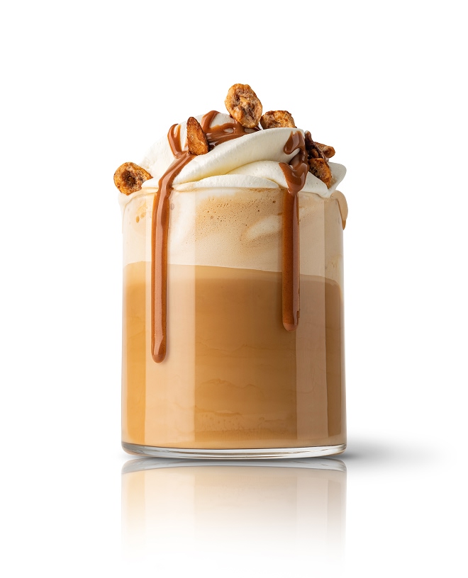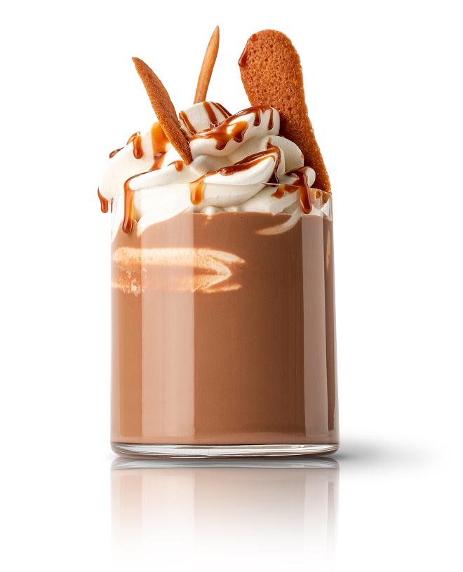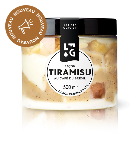 Crème glacée au mascarpone sublimée par les créations de nos pâtissiers : un marbré de biscuit enrobé de cacao et une sauce au café du Brésil infusée à chaud.